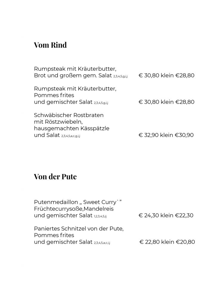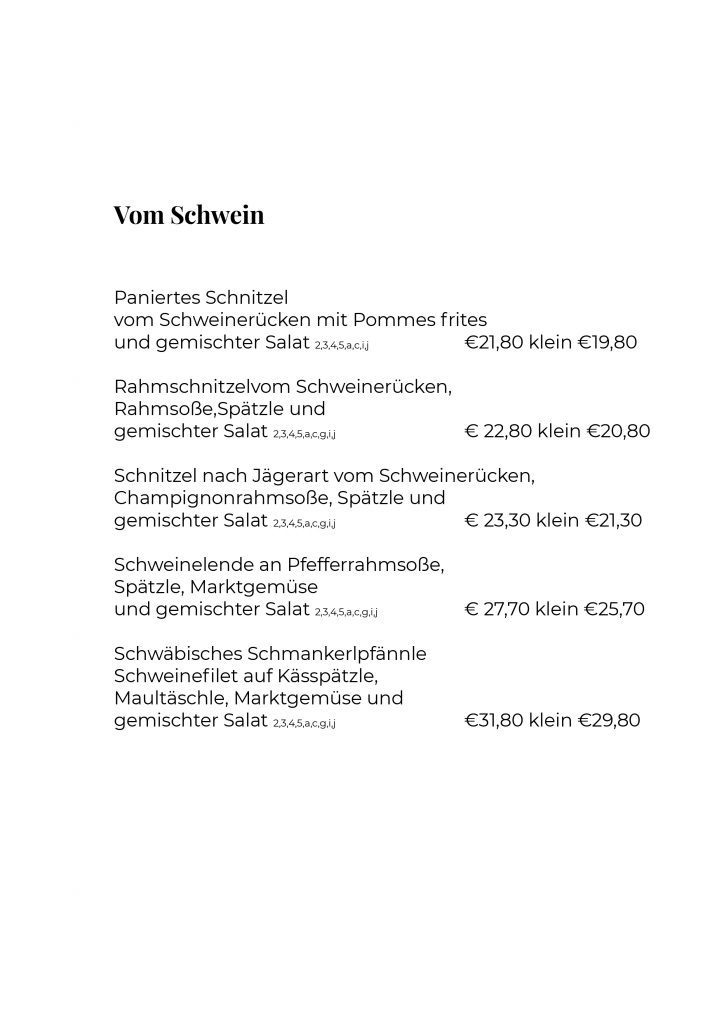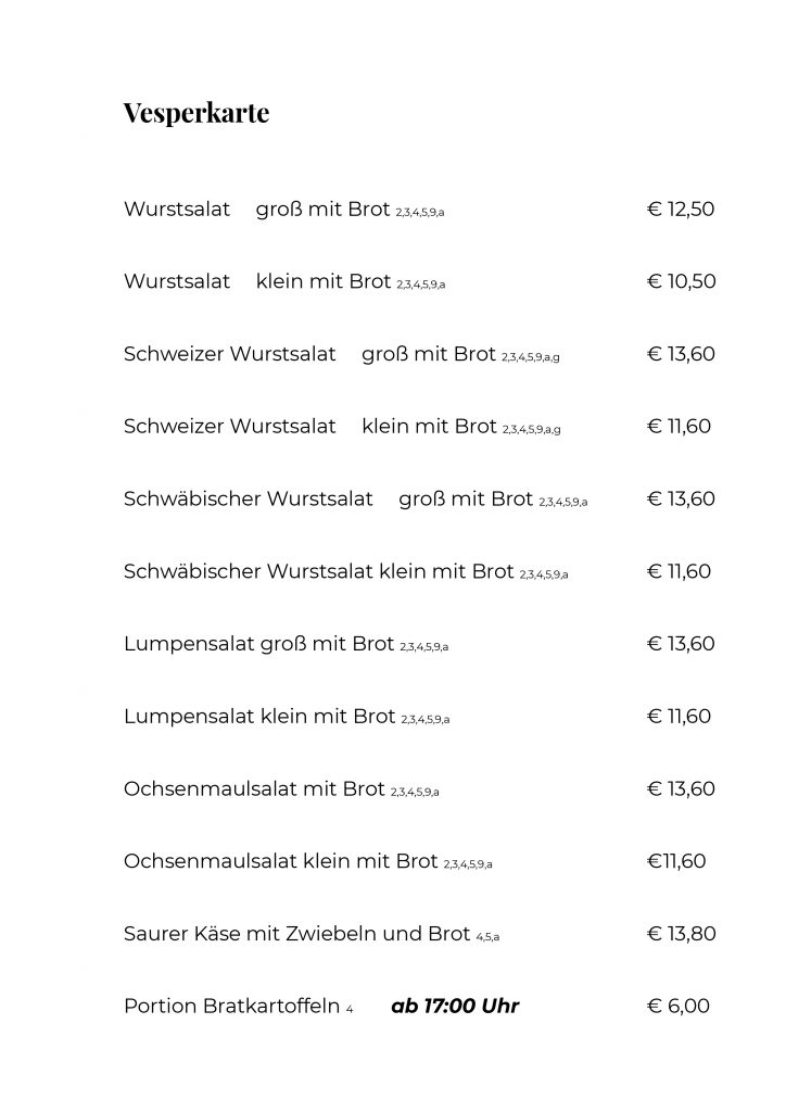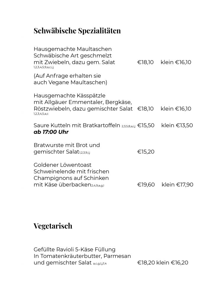 Aber auch hausgemachte Spezialitäten sind bei uns eine Selbstverständlichkeit. Die handgemachten Spätzle, die Maultaschen und Tellersülzen sowie Salate & Soßen und natürlich unsere Suppenbrühen und Flädle unserer Traditionsküche sind wahre Gaumenfreuden.